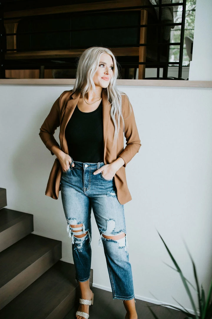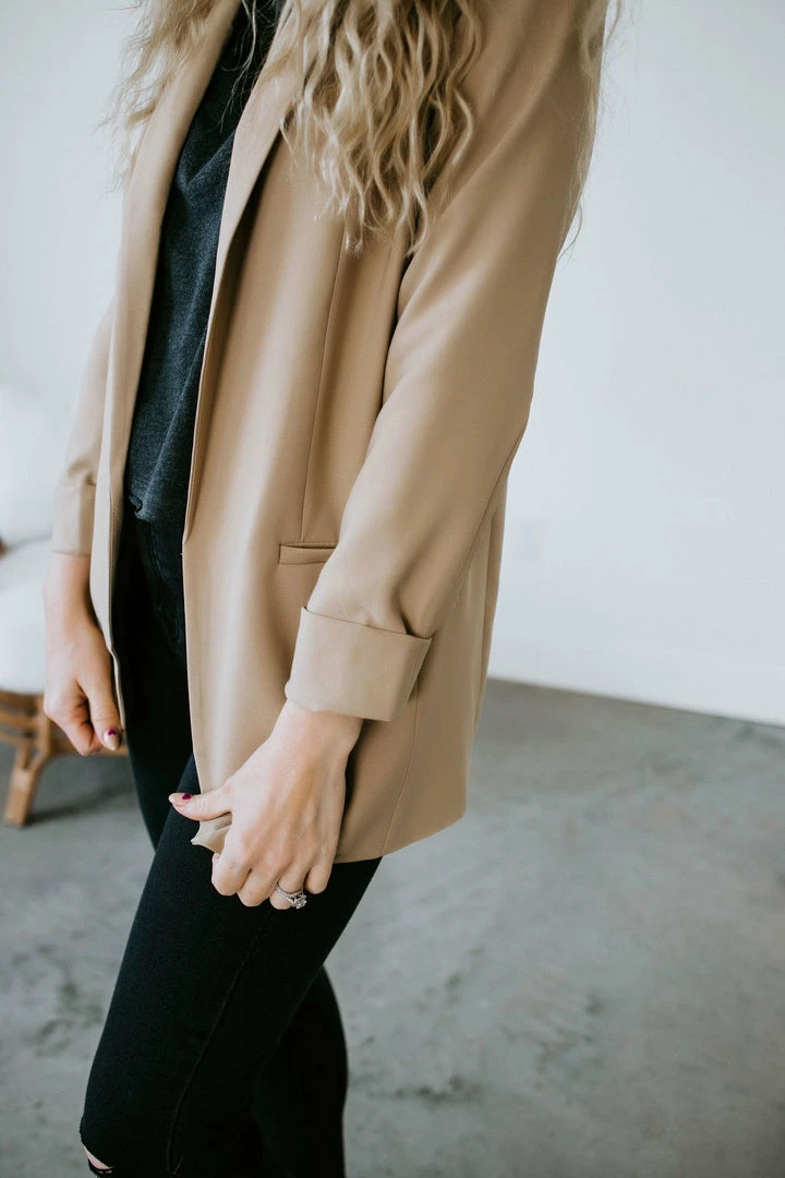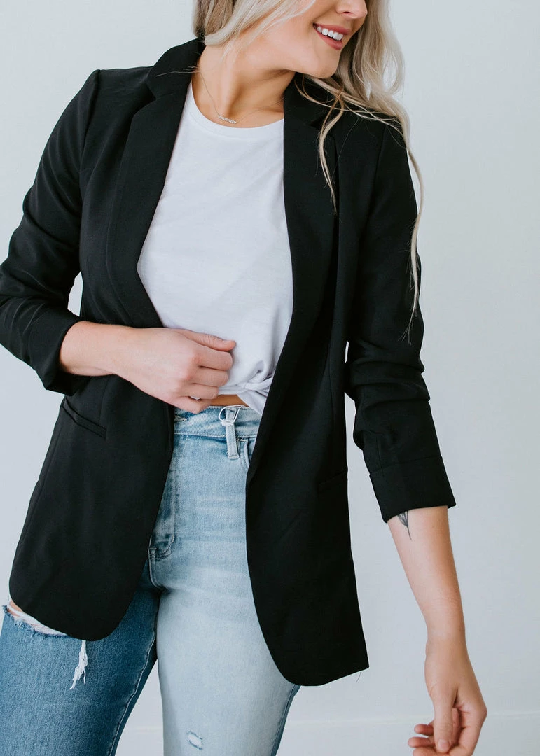 She’s all business! Be ready to slay the day when you layer on this sophisticated blazer. Woven fabric shapes a collared neckline, notched lapels, and long sleeves with a folded cuff detail. The sleek open-front silhouette is finished with padded shoulders and two welt pockets. Lined. Kaylor and Shelby are wearing a medium. Leslie is wearing a small.