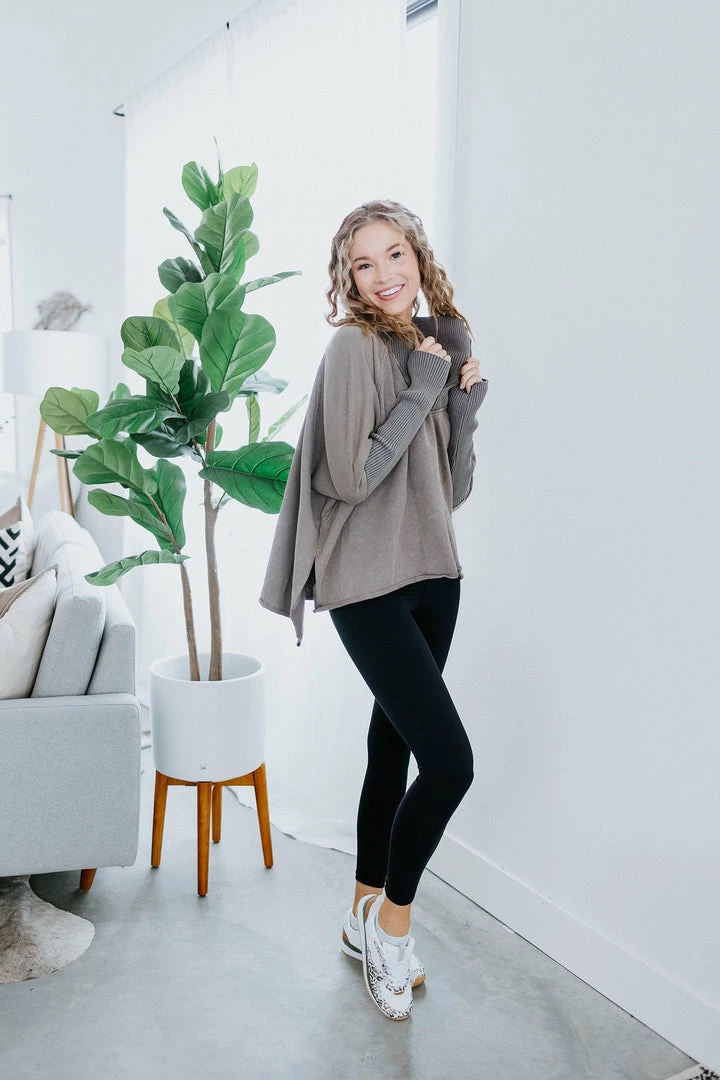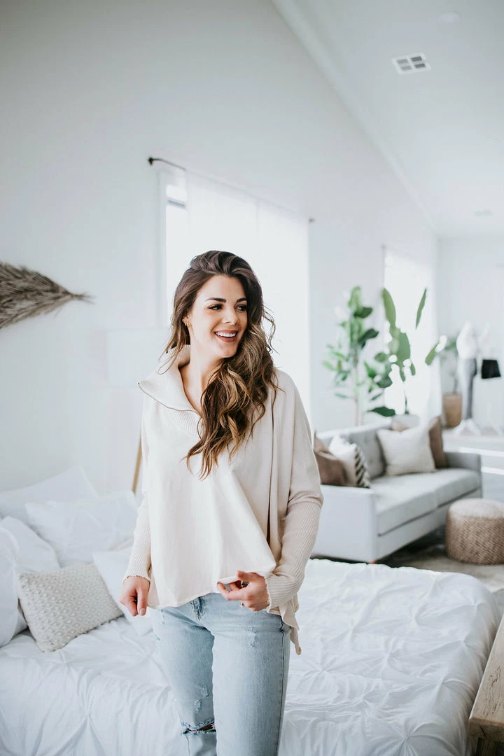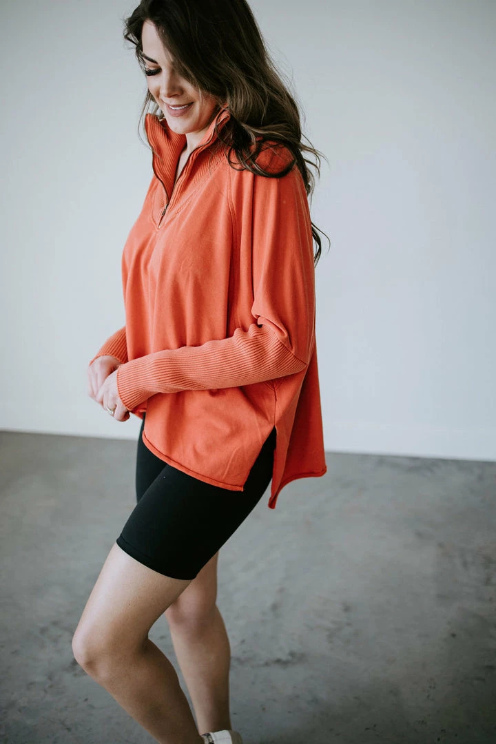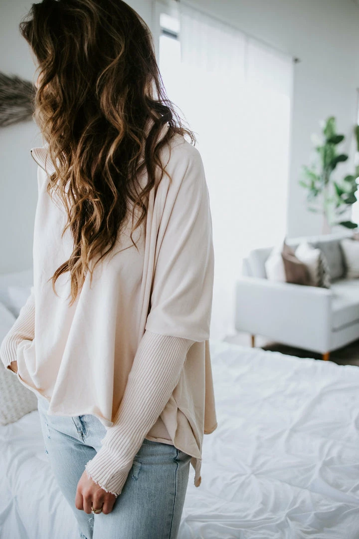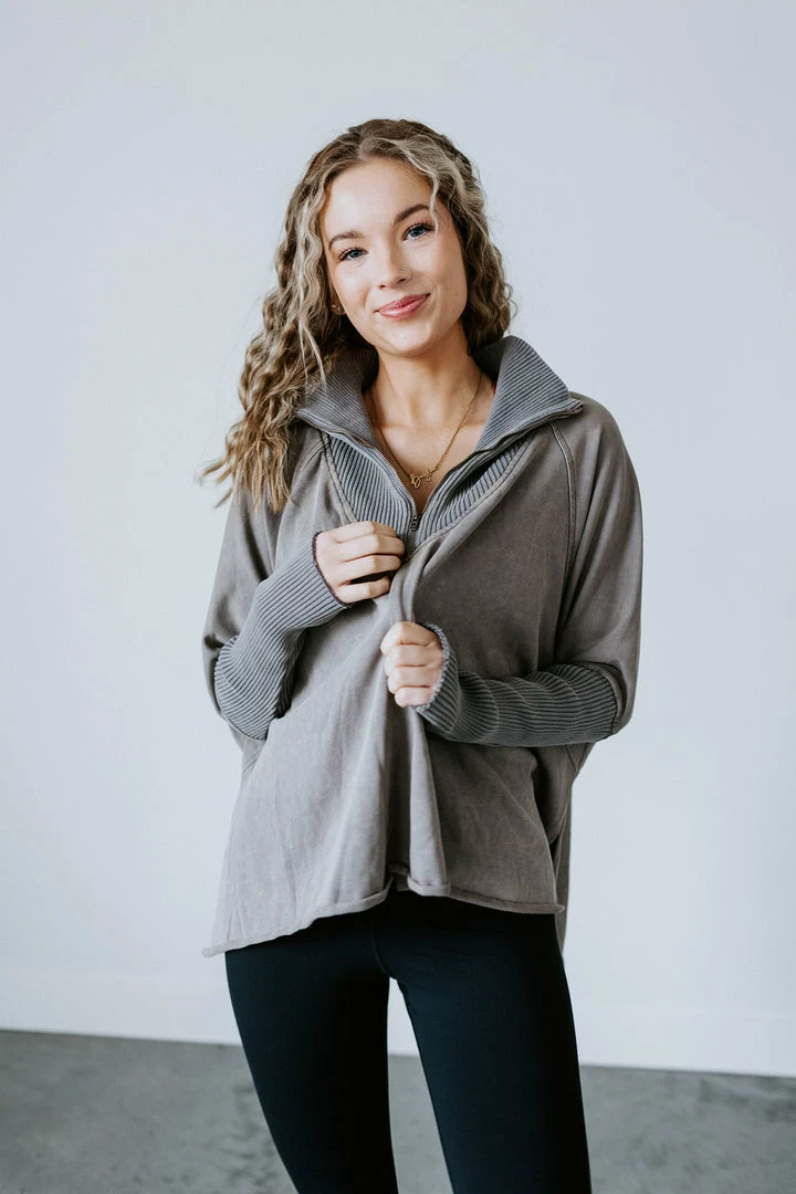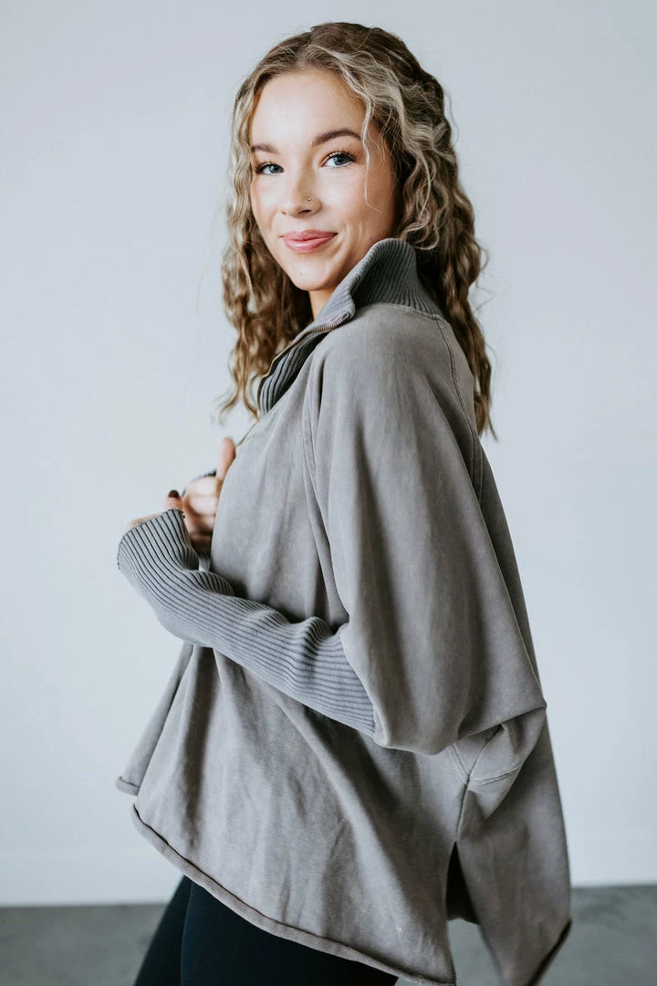This slouchy pullover is the definition of casual cool! Features a relaxed fit with a quarter zip closure, dropped shoulders, and dolman sleeves. Cut from soft cotton with a subtle mineral-washed look for added laidback appeal. Styled with ribbed knit accents at the mock neckline and sleeves. Baylee and Kara are wearing smalls.