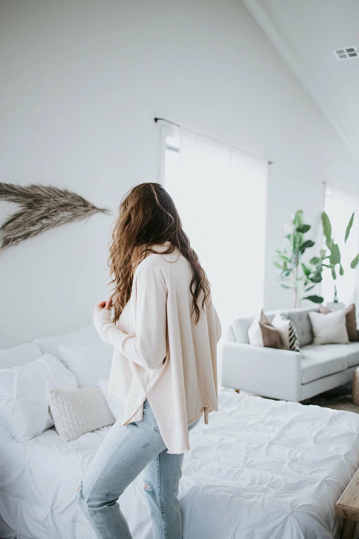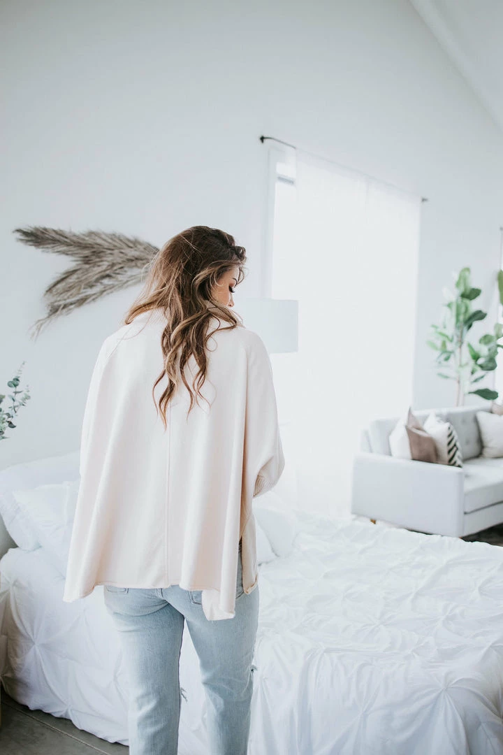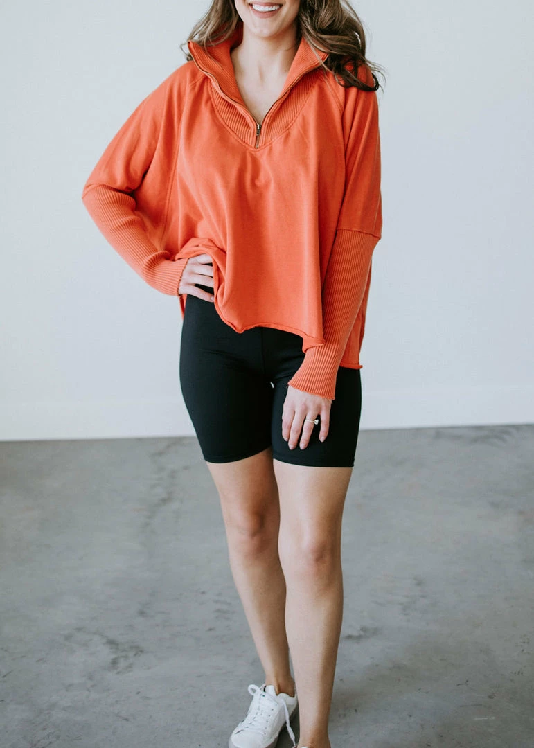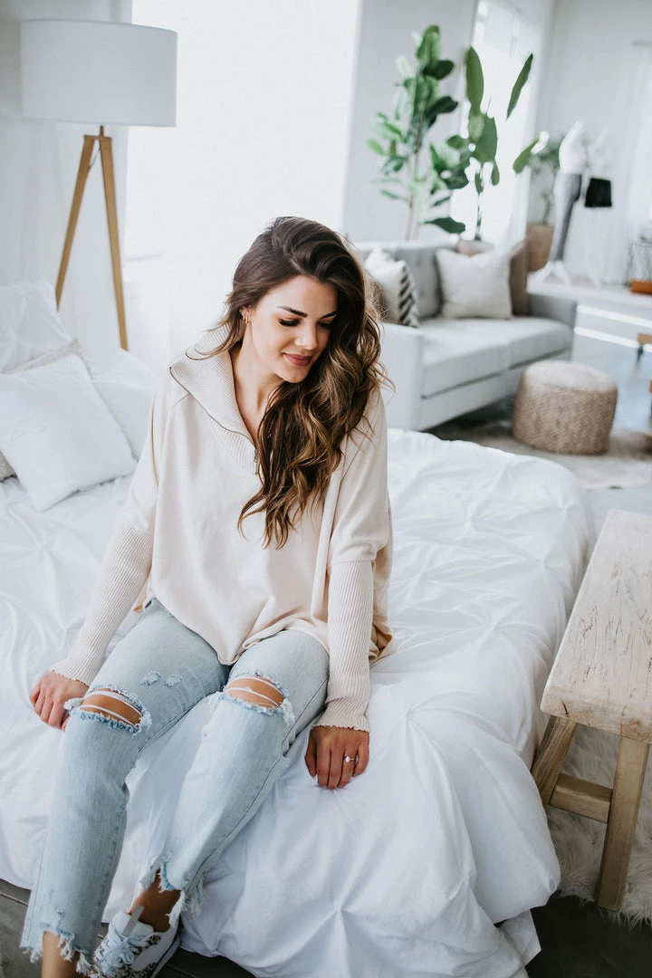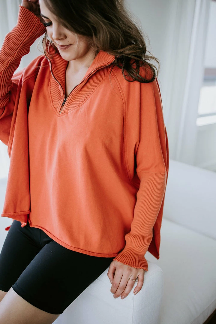This slouchy pullover is the definition of casual cool! Features a relaxed fit with a quarter zip closure, dropped shoulders, and dolman sleeves. Cut from soft cotton with a subtle mineral-washed look for added laidback appeal. Styled with ribbed knit accents at the mock neckline and sleeves. Baylee and Kara are wearing smalls.