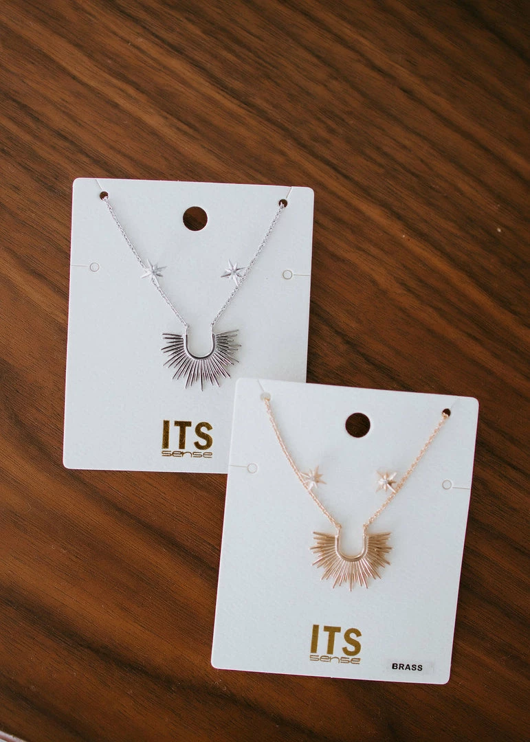 Bring light to any outfit with this sunburst necklace with matching earrings!