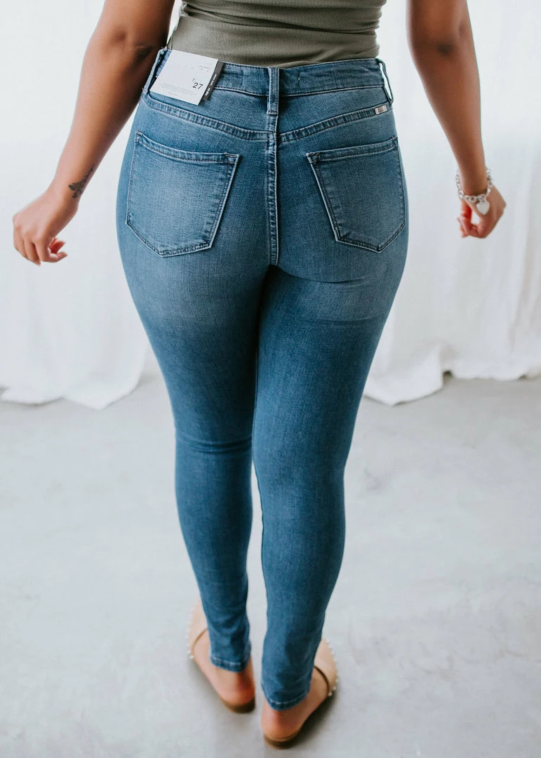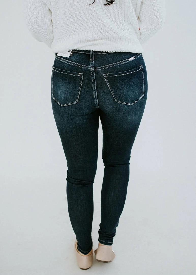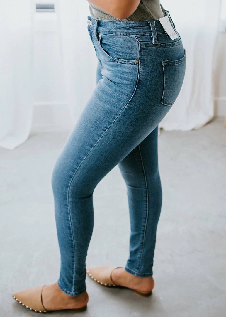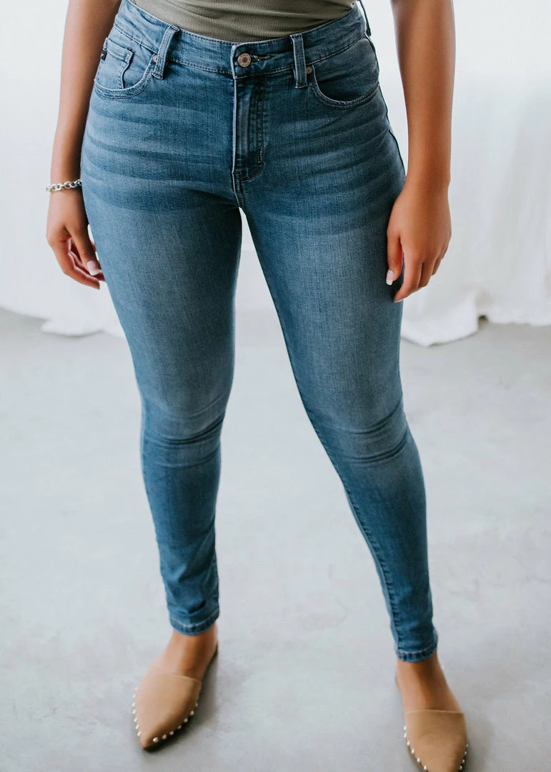 Keep it cool and casual in these super skinnies from KanCan! The classic 5-pocket design features a zip fly closure and a body-hugging silhouette. Crafted from luxuriously soft stretch denim and styled with subtle whiskering and fading. Pair with any of your favorite tops for an unbeatable look. Laurie is wearing her typical size 5. Cathyliana is wearing a size 7.
