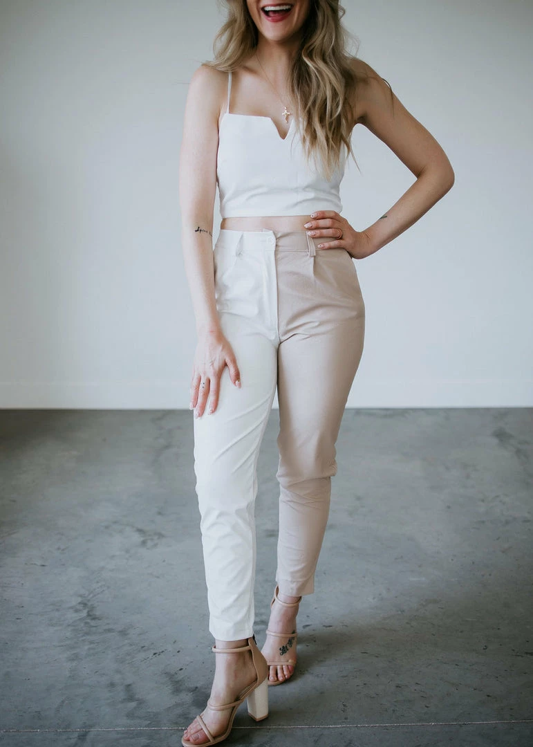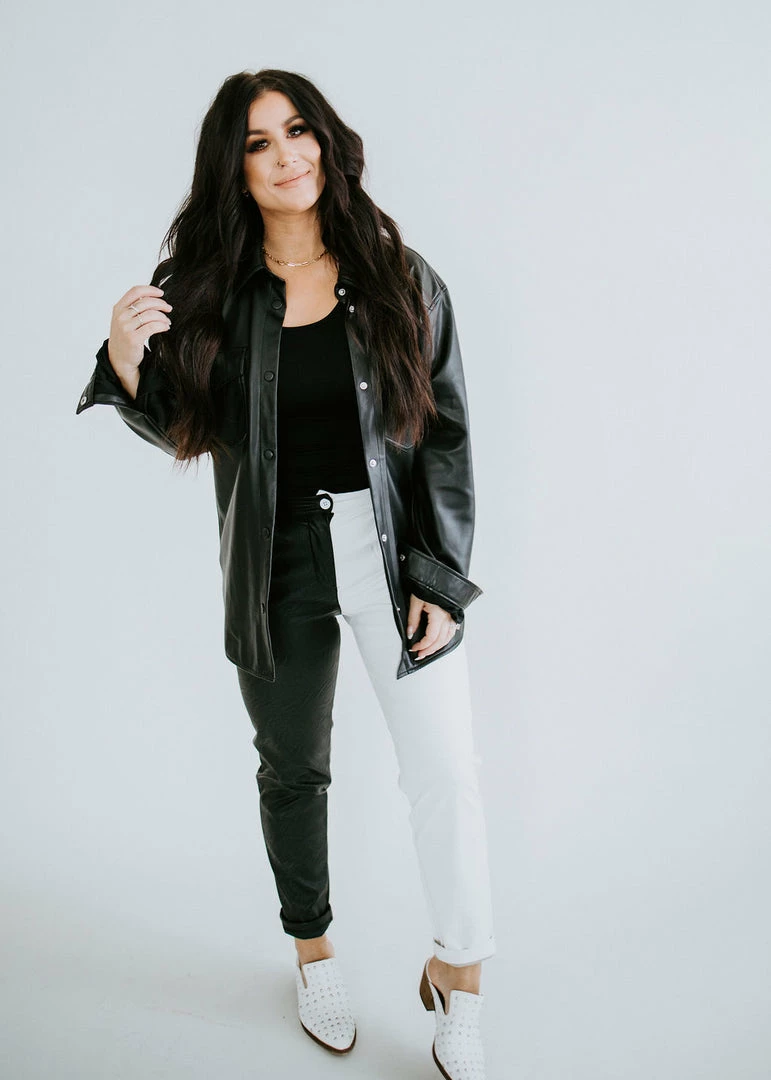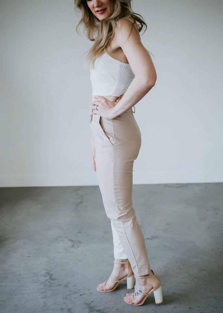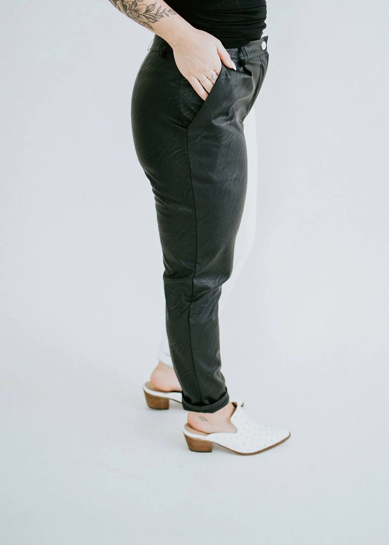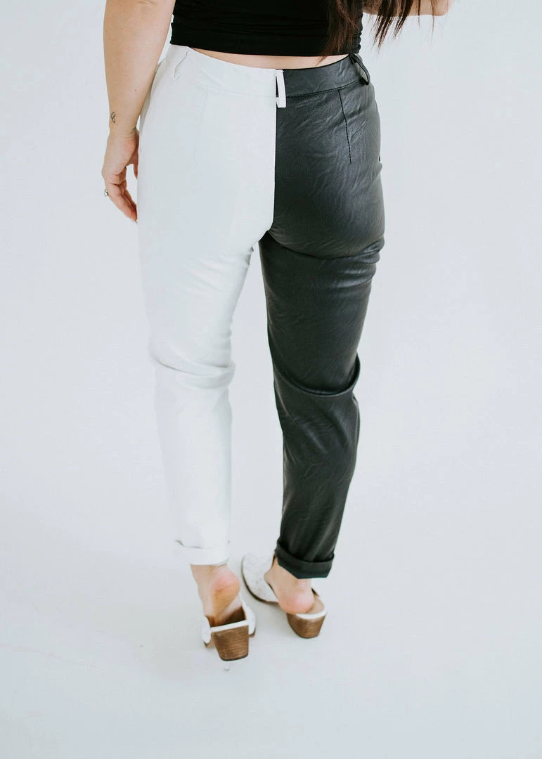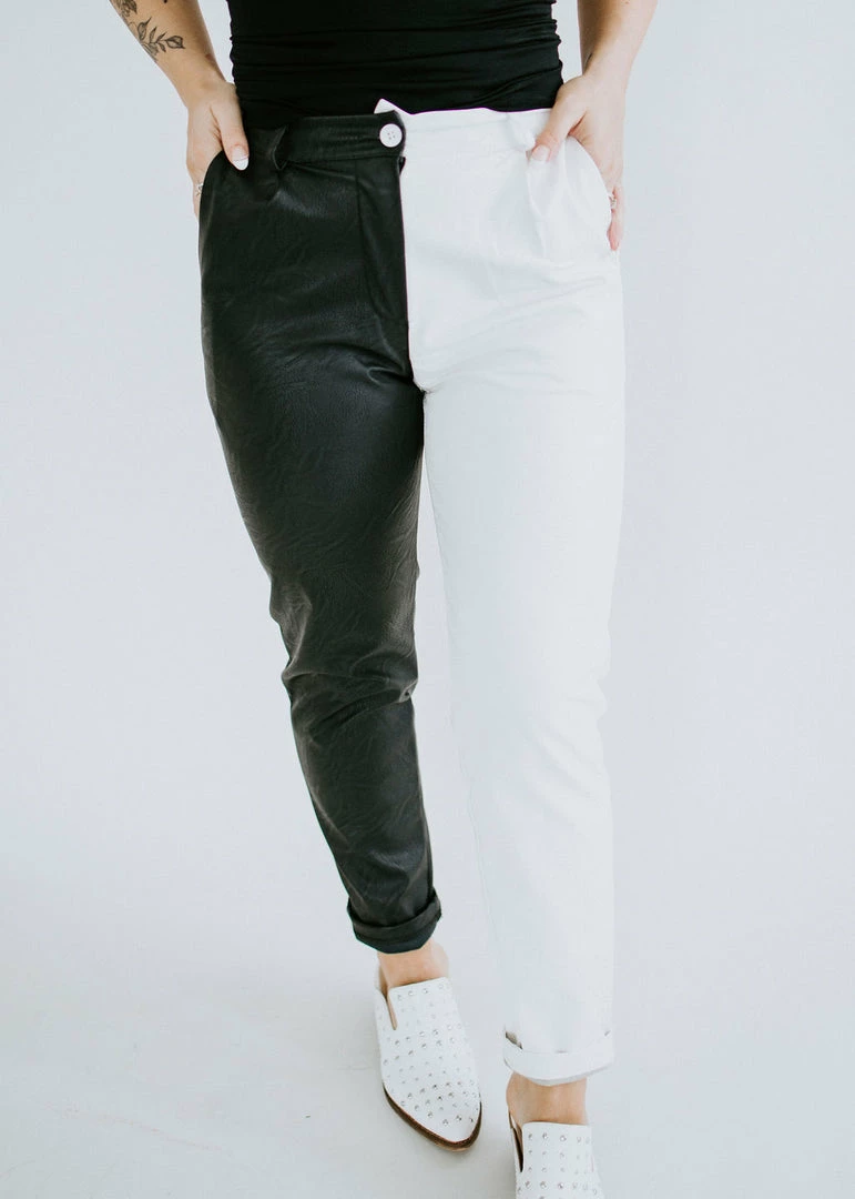 You can’t go wrong with these spicy leather pants! These faux leather beauties feature belt loops, side pockets, and a two-tone color block design split evenly down the middle. Skinny fit. Wear these to wow the crowd wherever you end up. Chelsea and Leslie are wearing small.