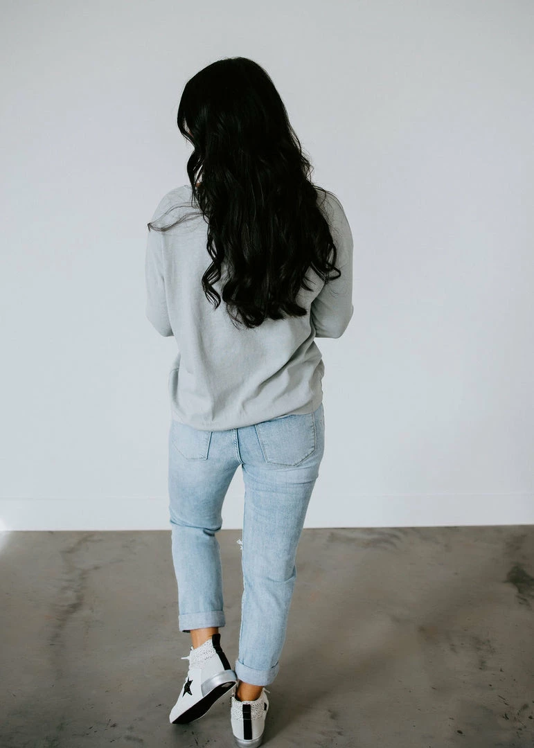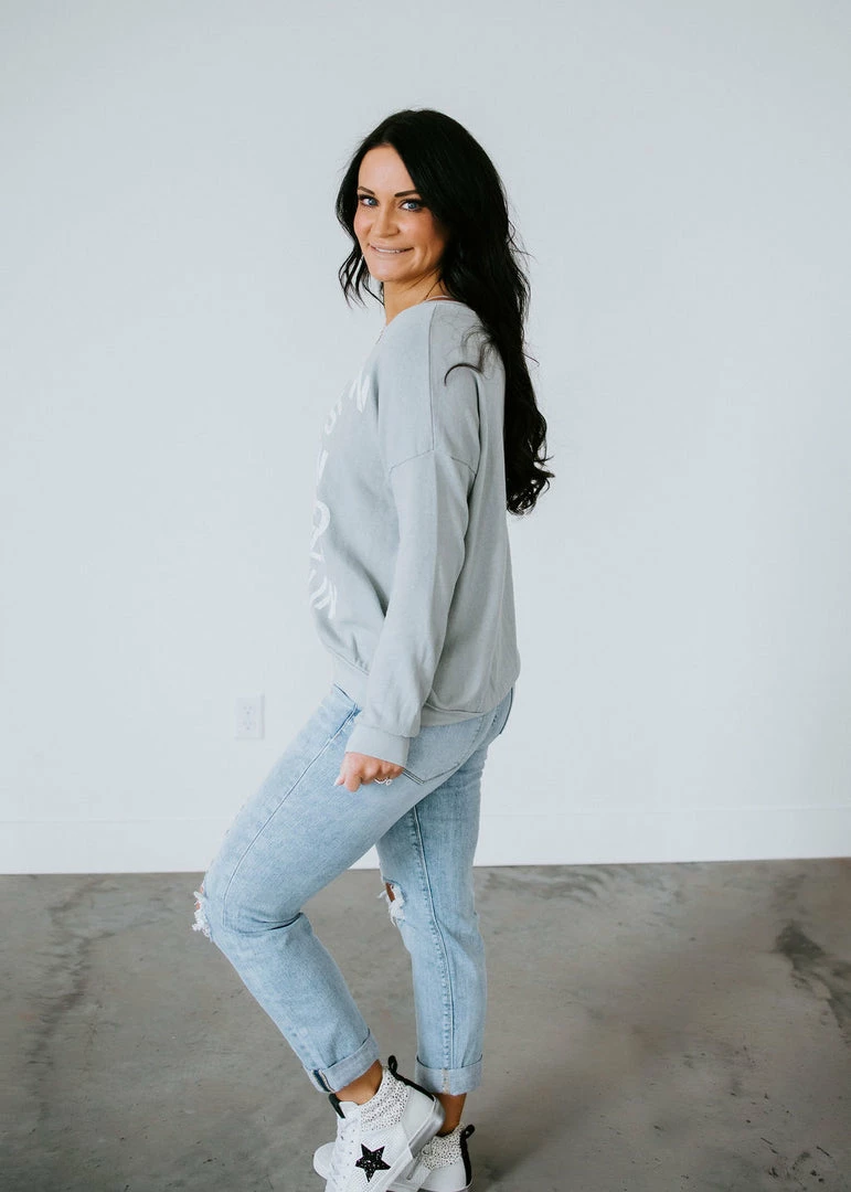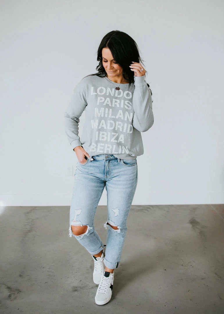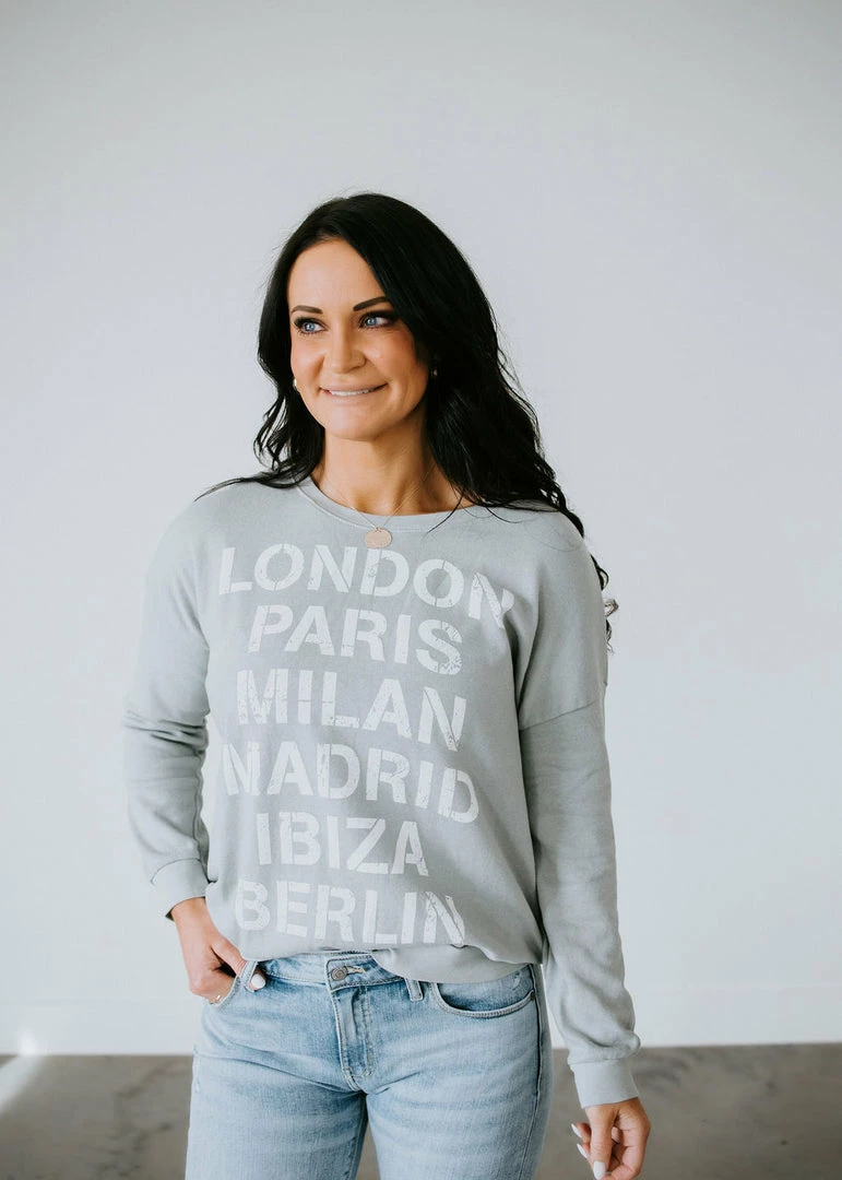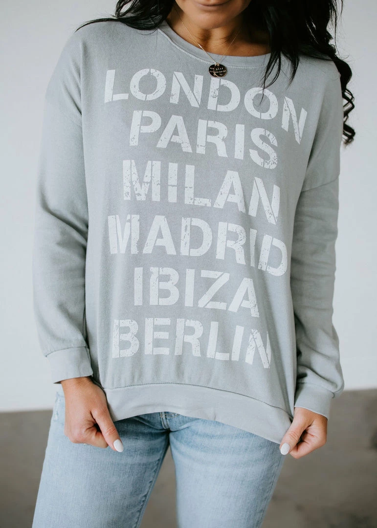 You’re going places! This graphic pullover is shaped by a comfy cotton blend and rendered in a gorgeous hue that will go with everything in your closet. Designed with a crew neck, long sleeves, and banded hem. “London Paris Milan Madrid Ibiza Berlin” is printed on the front in white lettering.