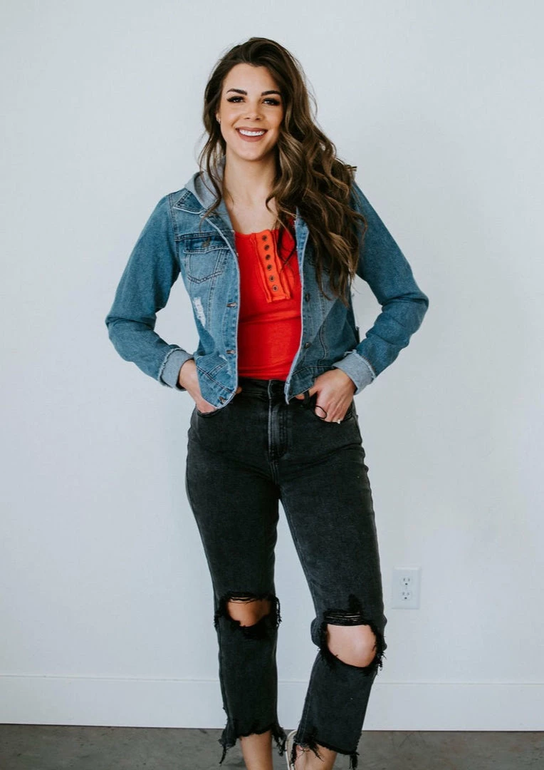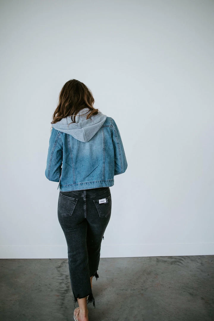 One of your favorite styles just got a cozy-cute update! A heather grey fleece hood accents the collared neckline of this medium-washed denim jacket. Features classic details you know and love, like a button-up front closure, two flap pockets at the chest, and fleece cuffs. The slightly fitted silhouette is finished with light distressing and fading. No stretch. Kara is wearing a small.