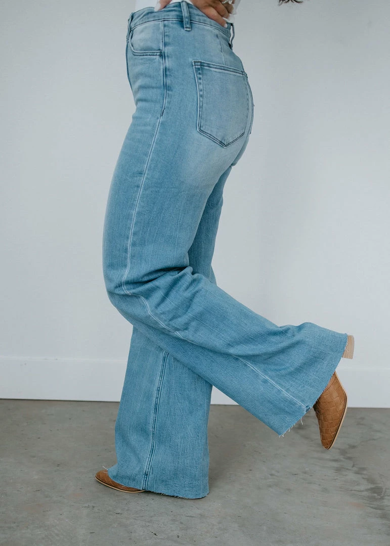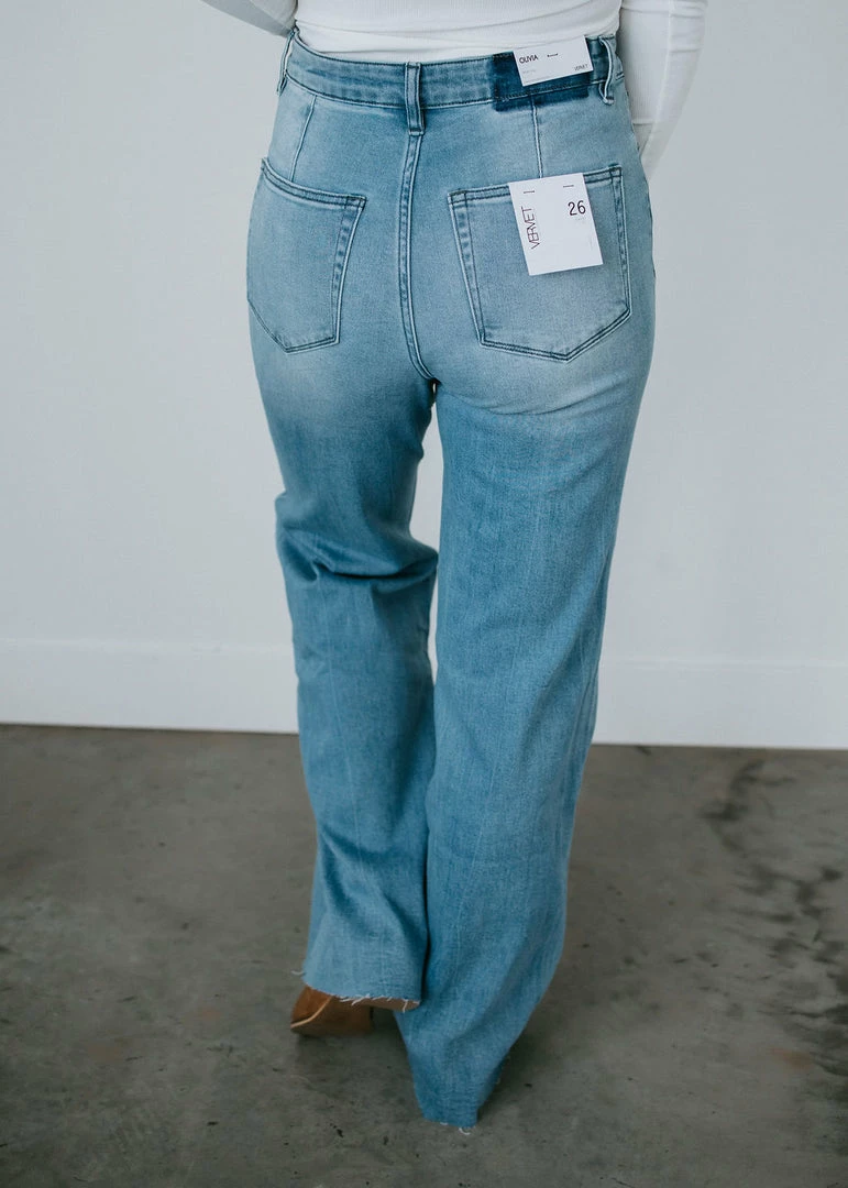 Talk about closet essentials! Don’t miss these need-now jeans from VERVET by Flying Monkey. Cut with a trendy wide-leg silhouette and finished with raw hems and darts above the back pockets. Rainey is a five-pocket design made from light wash denim with subtle whiskering and fading for a bit of lived-in character. Laurie is wearing a 26 but prefers a 25.