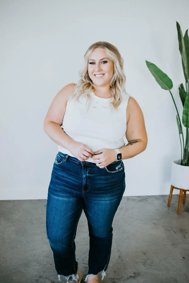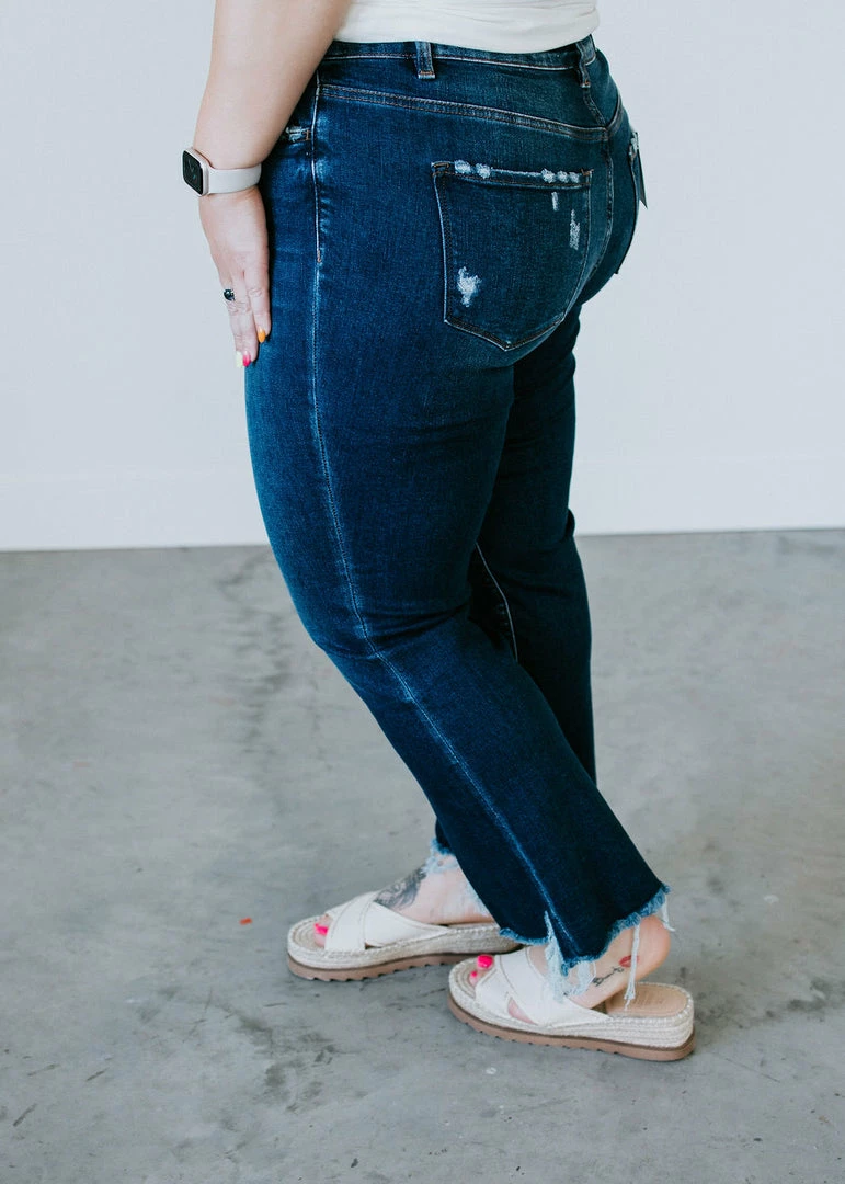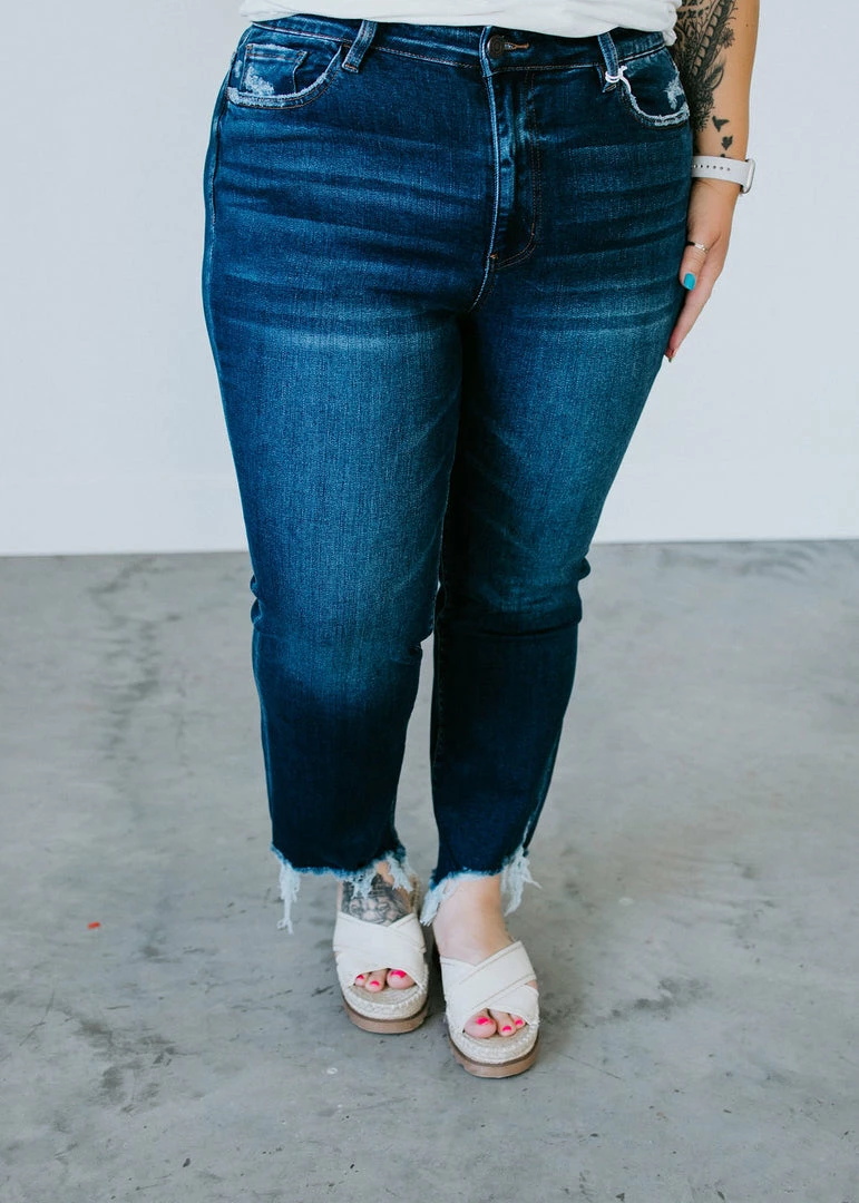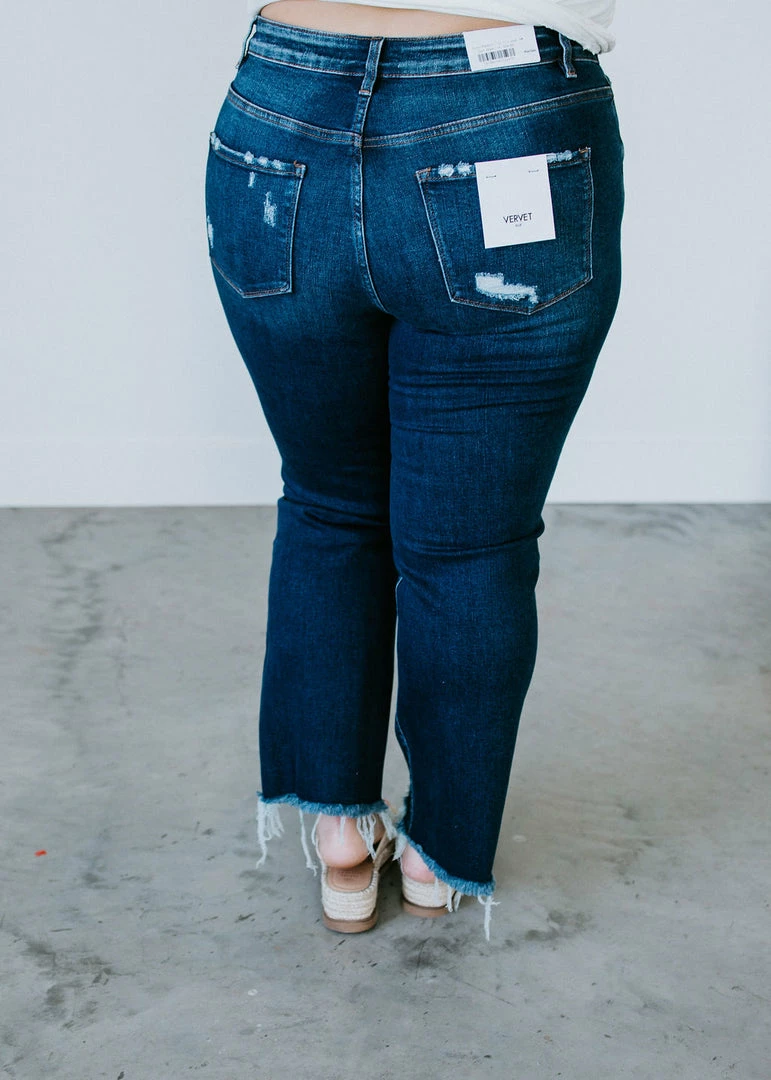 You can’t go wrong with these standout jeans from Vervet by Flying Monkey. These high-rise jeans feature an ankle flare cut and uneven frayed hems. Comfort stretch denim in a sleek dark wash shapes the five-pocket silhouette. Zshooshed up with light distressing. Pair with all your favorite tops to create so many casual-cool looks.