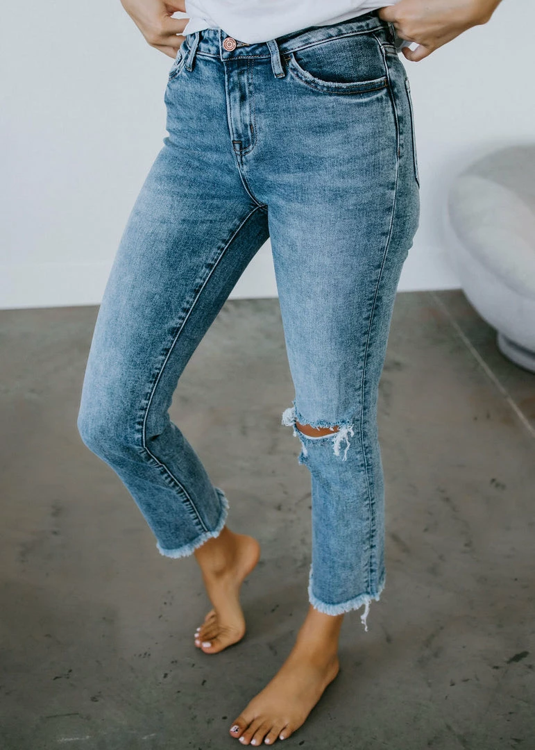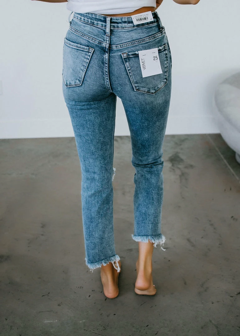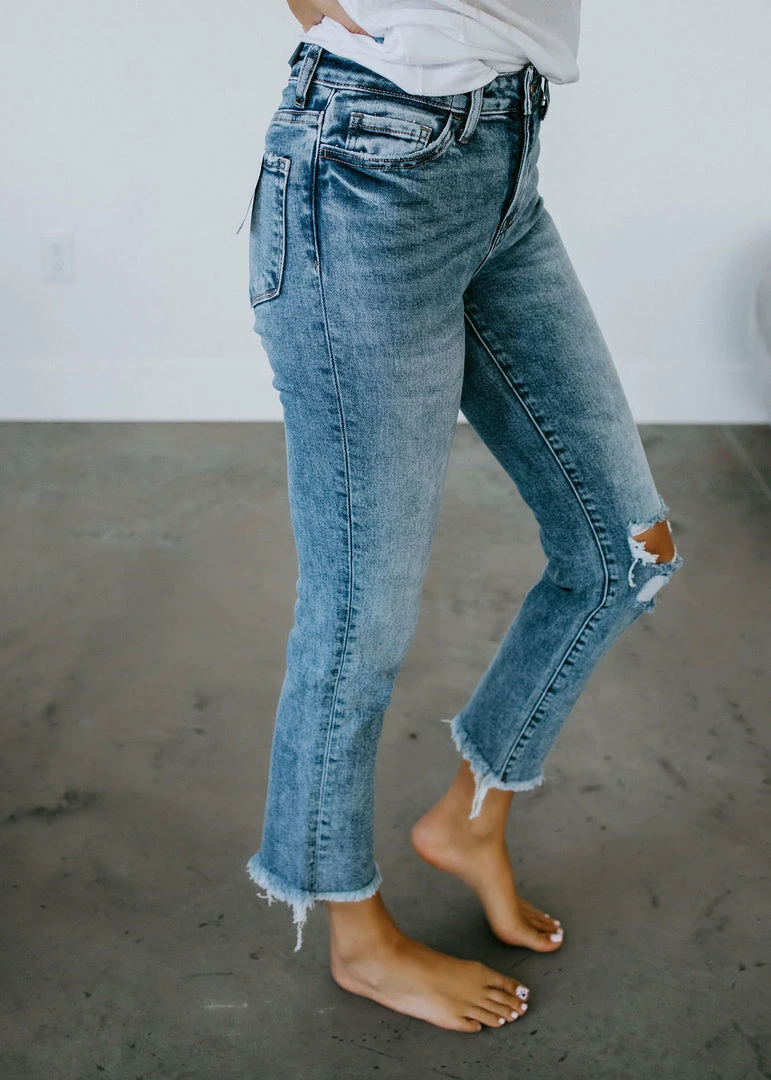 Look effortlessly cool in the Lovie Straight Crop Jean from VERVET by Flying Monkey! The exposed knee slit and frayed hem enhance the medium-washed denim for an oh-so-trendy look. Made from a comfort-stretch cotton blend with a five-pocket cut, a cropped hem, and zip fly closure. Baylee is wearing a size 25.
