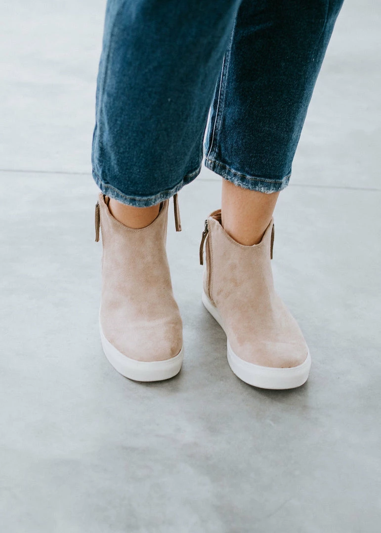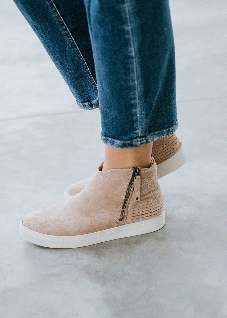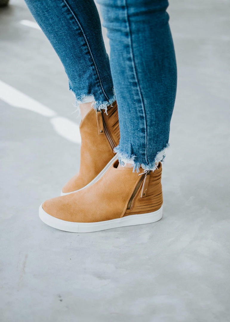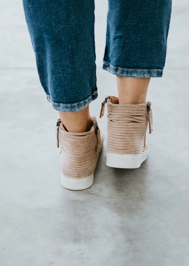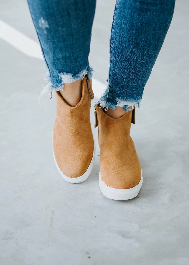 Get out and about in style with these new wedge sneakers. This is a classic casual design that features a walkable wedge heel. Zip-up design styled with a back cut-out strip. Rubber sole and lightly padded footbed.