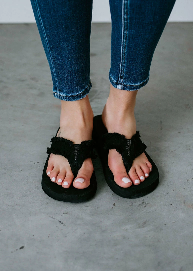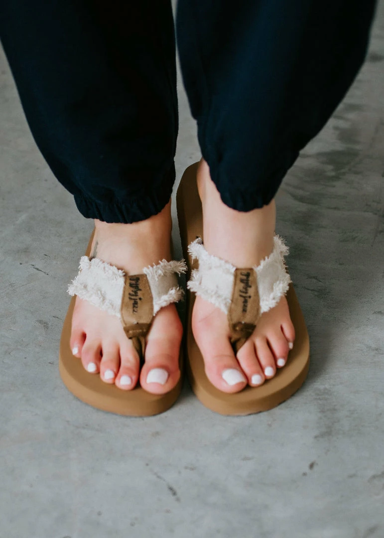 Sunny skies ahead! These stylish sandals are bound to be your new go-to. Features a slip-on design with comfortable thong-style construction. Frayed edges on the thick canvas strap add to the laidback look.