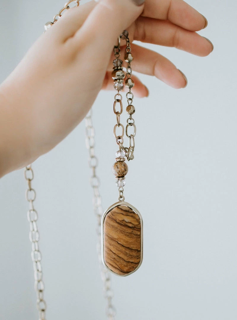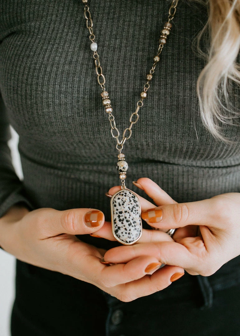 Make a statement in our Raylen Natural Stone Necklace! This long necklace features a natural stone pendant on a chain-link decorated with eye-catching facet beads. Lobster claw closure.